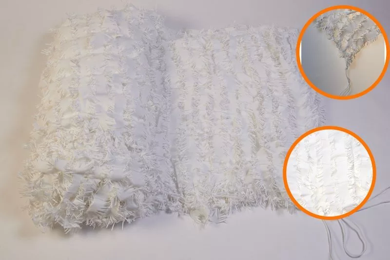 Чтобы облегчить себе задачу можно купить готовую капроновую сетку, однако существует вероятность, что нужного размера не окажется в наличии и тогда потребуется либо укорачивать, либо наращивать готовую конструкцию. Далее потребуется аккуратно вырезать из тканевого полотна декоративные элементы. Этот трудоемкий процесс может отнять большое количество времени. Материал лучше выбирать синтетический. Также можно использовать натуральное лыко или природные материалы (листья, ветки и пр.). На последнем этапе потребуется аккуратно закрепить камуфляжные элементы на капроновой основе. Их можно просто привязать, но данный способ крайне ненадежен. Лучше использовать скрепки или нитку с иголкой.